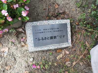 現在、坪田譲治の生家は残っていませんが、跡地には彼の詩碑が建てられています。そこには、89歳で岡山市名誉市民となった譲治が故郷を想い詠んだ「心の遠きところ/花静かなる/田園あり」という詩が刻まれています。